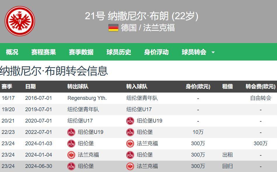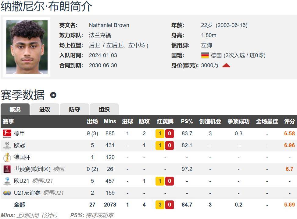 现年22岁的N-布朗,身高1.80,左脚球员,主打左后卫位置,也可以踢左中场,德转估价3000万欧元,现有合同至2030年。N-布朗本赛季至今各项赛事共为法兰克福出场18次,其中15次首发,合计出场1436分钟,贡献1球3助
