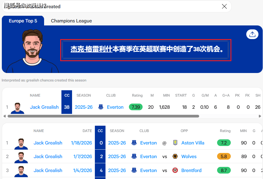 在本赛季的英超中,格拉利什是埃弗顿队内创造机会最多(38次)、助攻最多(6次)的球员。