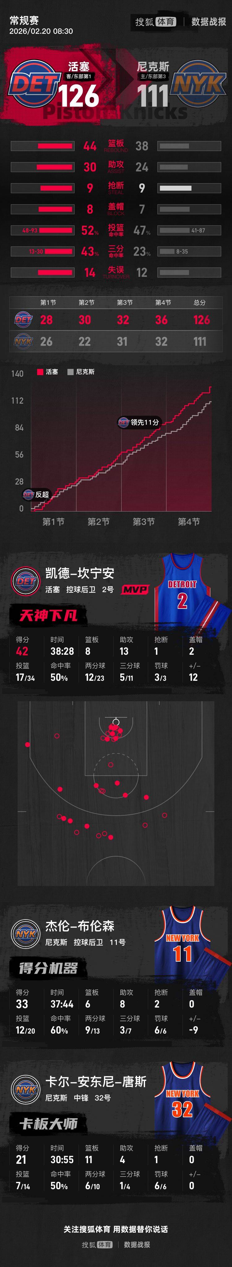 【搜狐体育战报】北京时间2月20日NBA常规赛,客场作战的活塞以126-111击败尼克斯,活塞取得4连胜。坎宁安42分8篮板13助攻,唐斯21分11篮板4助攻。