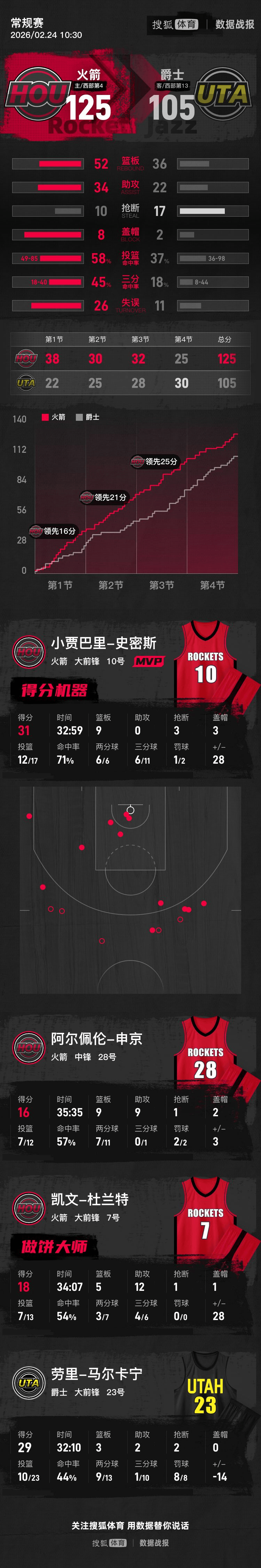第四节,火箭在开局状态良好,以一波进攻将优势进一步扩大至28分。节中爵士组织反击,有效地缩小了分差至16分。然而,火箭很快调整策略,保持进攻节奏,逐步拉开比分。爵士的森萨博在本节继续表现出色,收获10分,其中包括2记三分球。最终,火箭以125-105赢下比赛。