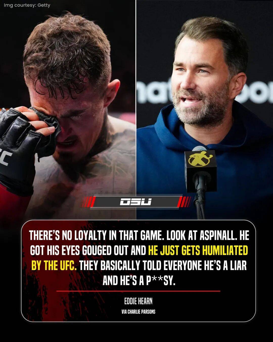 赫恩说:“这个行业毫无忠诚可言。看看汤姆-阿斯皮纳尔,眼睛都被人挖了出来,UFC却对他百般羞辱。他们简直是在告诉所有人,他是骗子和胆小鬼。”