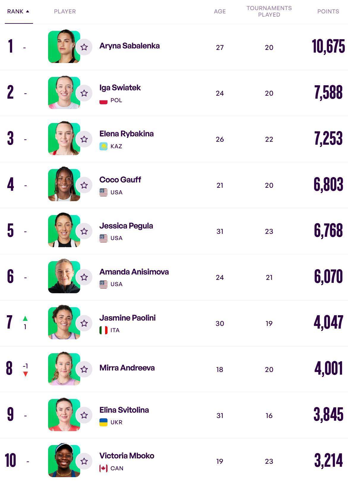 同样不能忽视的是,排在第5位、刚刚在迪拜站斩获亚军的佩古拉,排在第7位的保利尼以及排在第9位的斯维托丽娜,年龄均为30+。