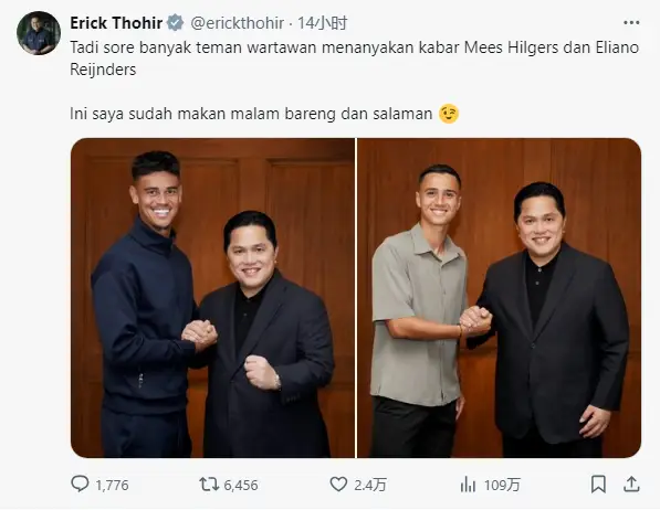 北京时间9月6日,世预赛C组首轮比赛中,印尼队在先进一球的情况下1-1战平沙特队,这一结果被视为一场小冷门。印尼足协主席托希尔随后晒出与两位效力于荷甲的印尼裔球员的合照,暗示他们已经归化成功。点击查看ESPN报道